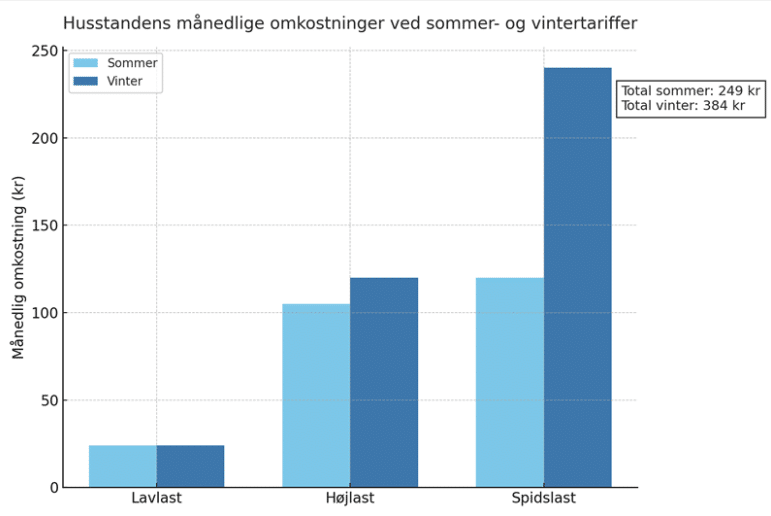 Grafen viser, hvordan en gennemsnitlig husstand rammes af forskellen på sommer- og vintertariffer. I sommermånederne ligger den samlede regning omkring 249 kr., mens den i vinterhalvåret stiger til 384 kr. Det svarer til en forskel på over 50 %.